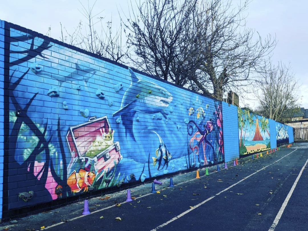 Complete school makeover. Our team meticulously designed and successfully completed three stunning murals that brought new life to the building's walls, showcasing bright colors and imaginative themes. Additionally, we transformed a dull, uninspiring playground into a vibrant and engaging fun space, filled with dynamic play areas and inviting features that encourage creativity and active play among students.