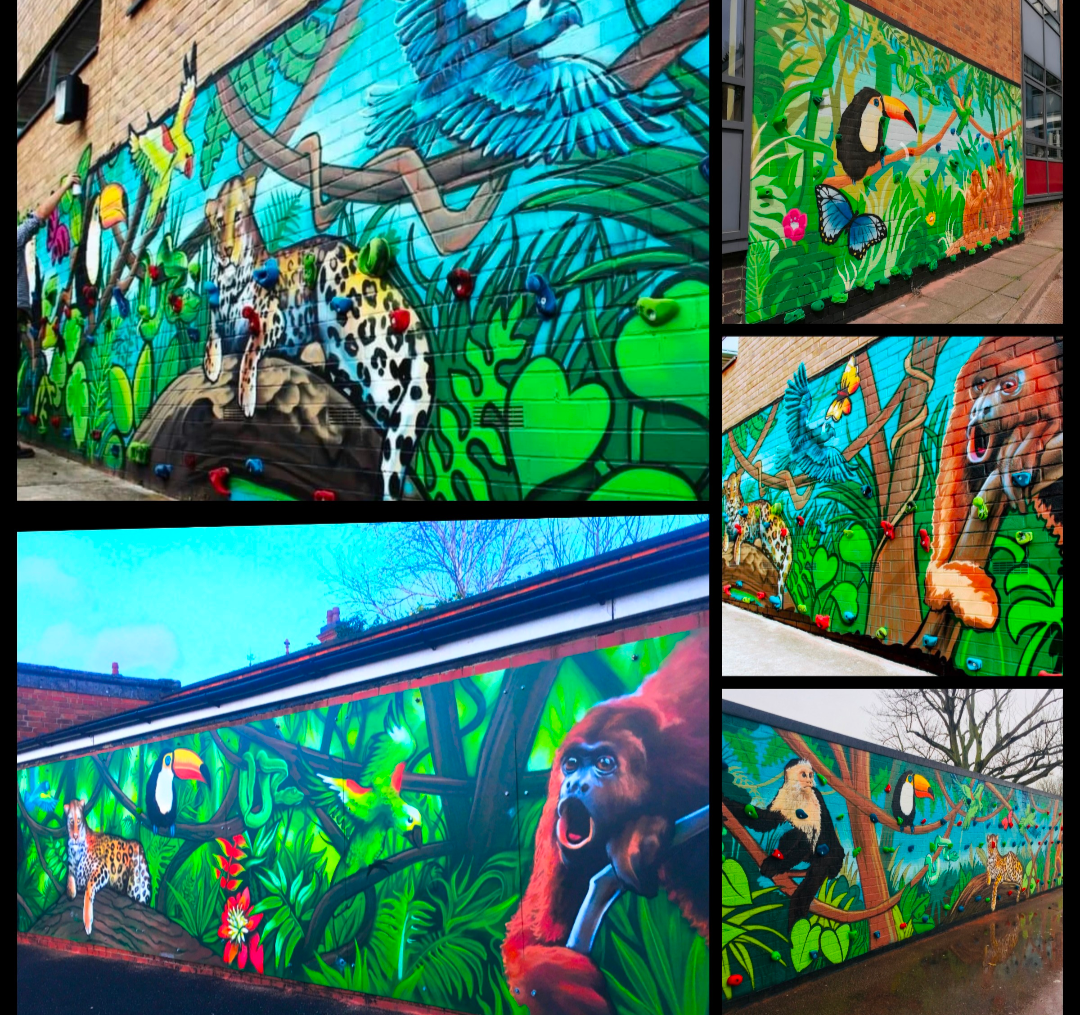 We enhance them with vibrant climbing holds that stand out against the colorful backdrop. Thanks to our meticulous priming and preparation, we’ve never needed to touch up any of our murals. We also ensure we apply the paint under the optimal condition